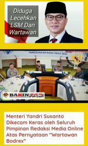 mengecam keras pernyataan Menteri Desa Yandri Susanto yang sangat di sayangkan telah melecehkan profesi wartawan dan LSM mengatakan ‘Bodrex’. Ini benar-benar bentuk penghinaan kepada wartawan dan LSM, justru kami selaku wartawan dan LSM sangat penting sebagai kontrol sosial tata kelola di instansi pemerintahan,” tegas Erwanto.